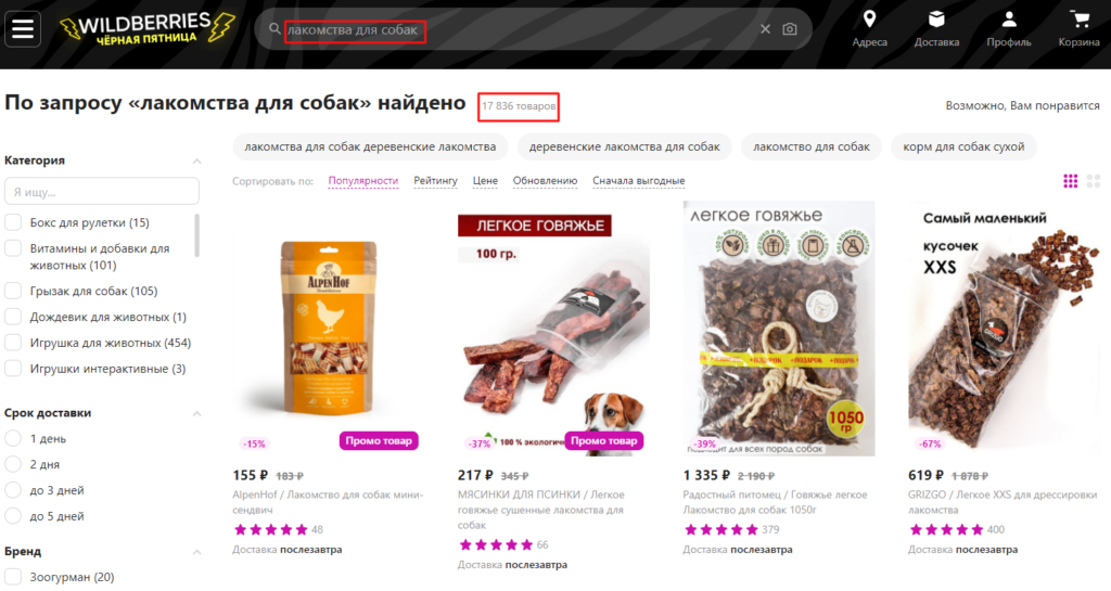 Среди продавцов лакомств для собак на Wildberries большая конкуренция: