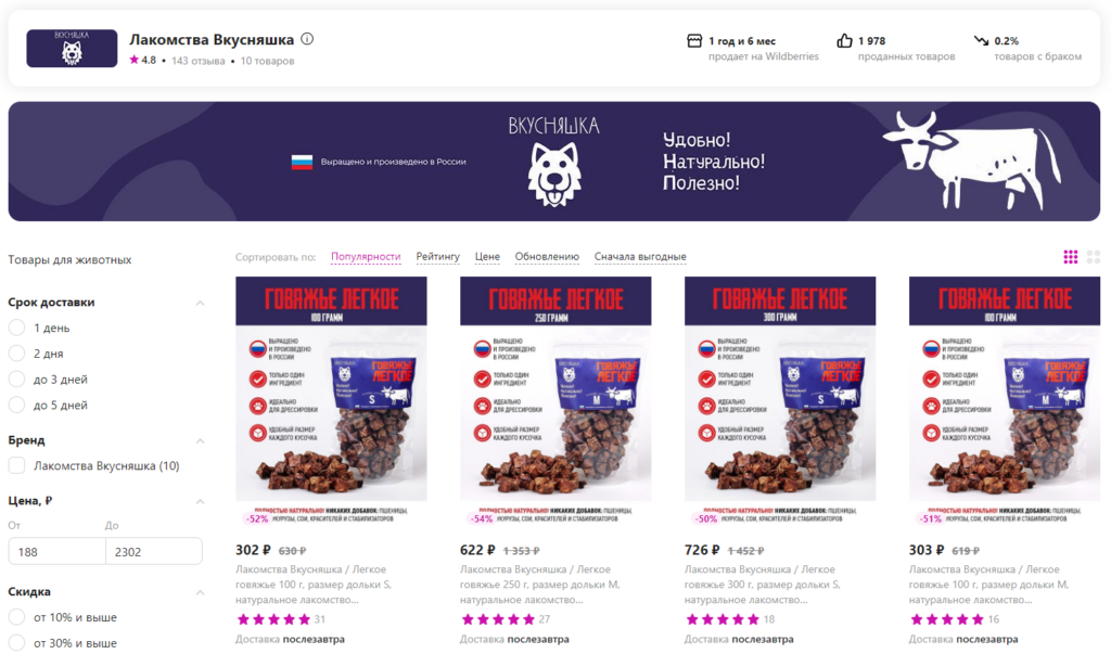 Магазин «Лакомства Вкусняшка» продает на Wildberries натуральные лакомства для собак отечественного производства.