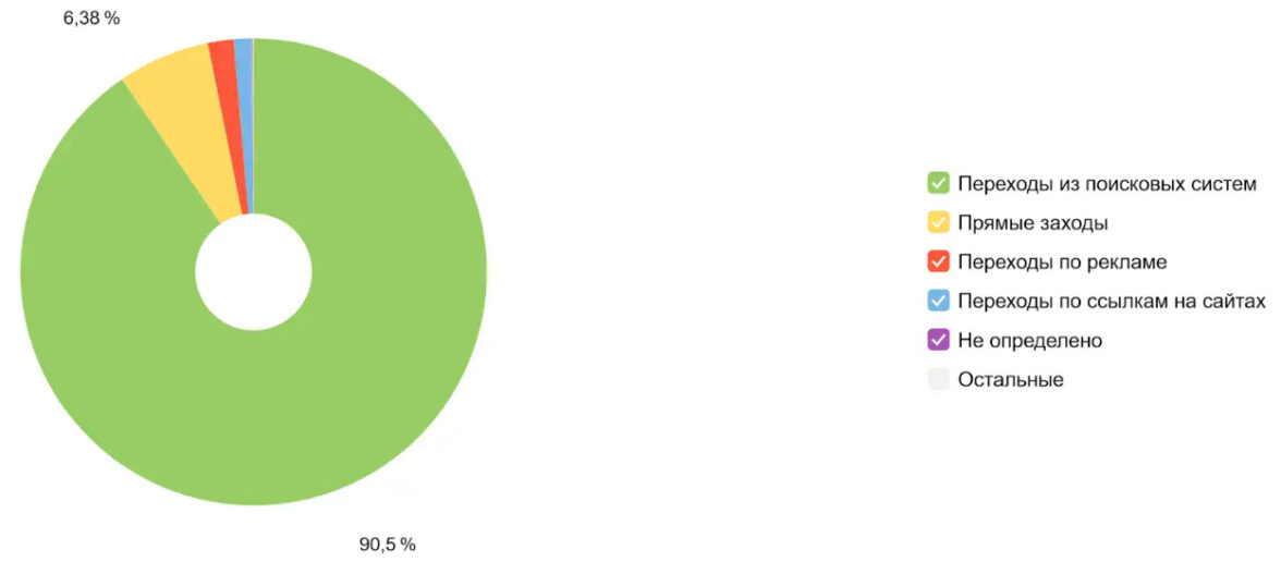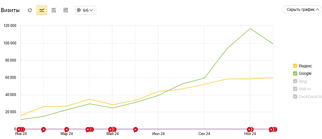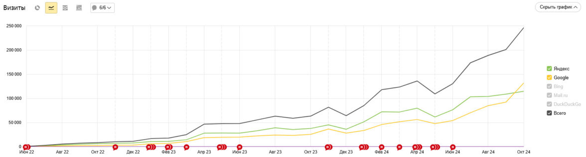 Спустя время Google перегнал Яндекс по трафику и видимости статей. Это говорит о том, что наш контент отвечает требованиям обоих поисковиков.