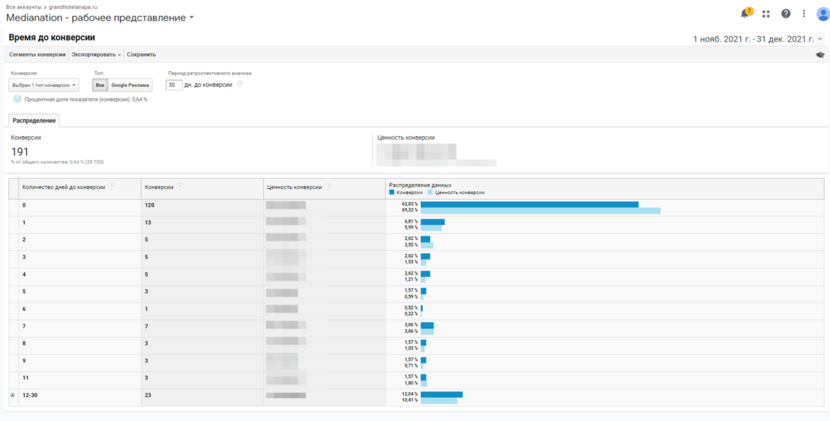 Пользователь, который выбирал отель, не сразу принимал решение о бронировании. Эту информацию красноречиво подтверждал отчет «Время до конверсии» в Google Analytics, где мы видели, что около 37% посетителей сайта принимают решение о бронировании после одного и более дня с момента первого касания с сайтом: