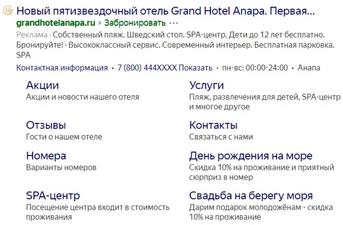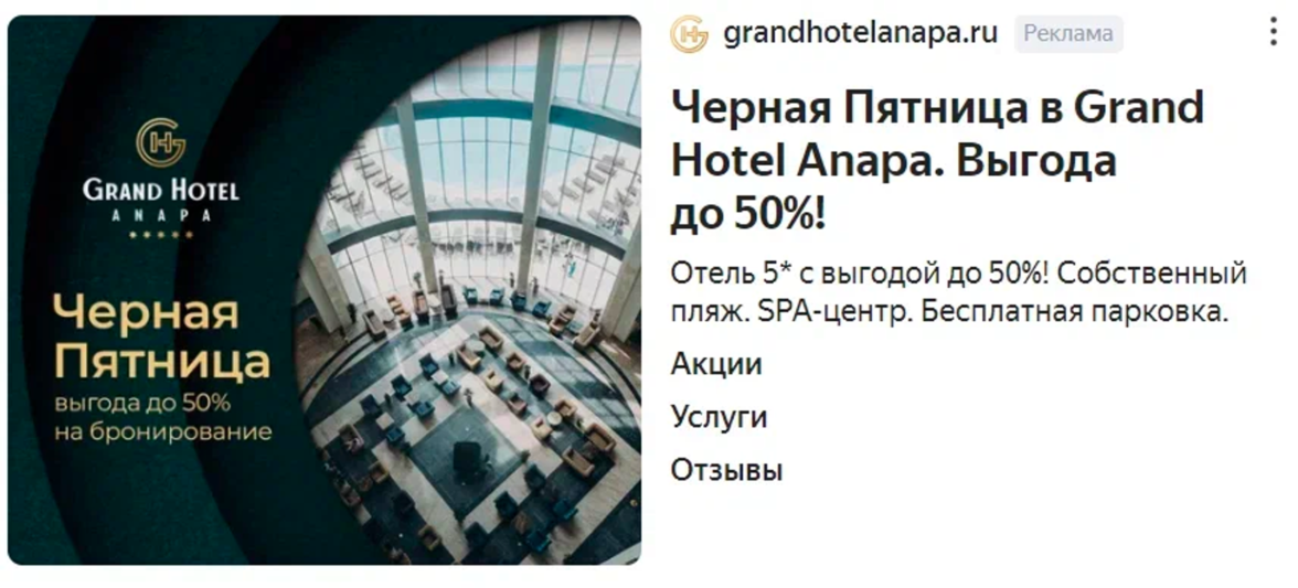 1. Брендовые запросы на поиске в Я.Директе и Google Рекламе. Все основные конкуренты показывали свою рекламу по нашим запросам «Гранд Отель Анапа» и «Grand Hotel Anapa». Было важно показываться на первых позициях по всем брендовым запросам отеля. В противном случае объявления конкурентов выкупают часть нашего трафика, забирая потенциальных клиентов.