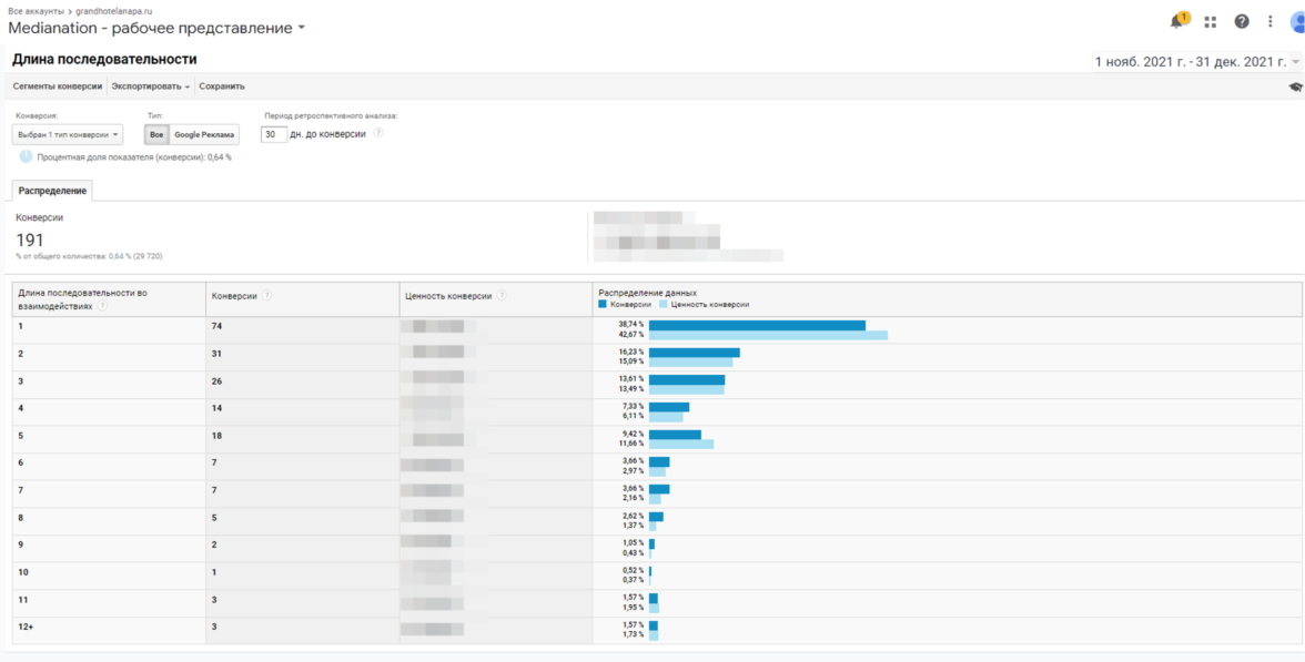 Мы также изучили отчет «Длина последовательности». Он позволял определить, какое количество касаний с сайтом требуется пользователю перед совершением бронирования. Выяснили, что более 60% бронирований через совершается пользователями, которые заходили на сайт более двух раз: