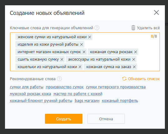 Умный алгоритм проанализировал контент сайта и порекомендовал ключевые слова. На их основе будут созданы объявления. Можно удалять предложенные системой фразы, добавлять свои или ключи из блока «Рекомендованные слова»: