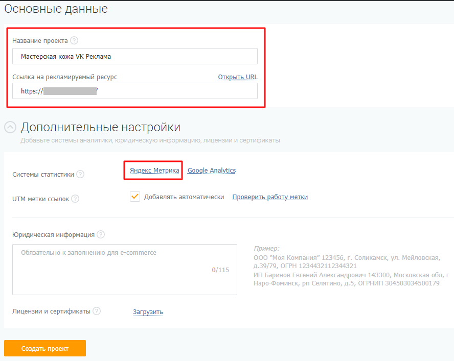 На первом этапе нужно заполнить основные данные проекта, указать название и URL сайта, внести юридическую информацию (для интернет-магазина это обязательно). Персональный менеджер посоветовал дать доступ к счетчику Яндекс Метрики для отслеживания статистики по трафику и конверсиям.