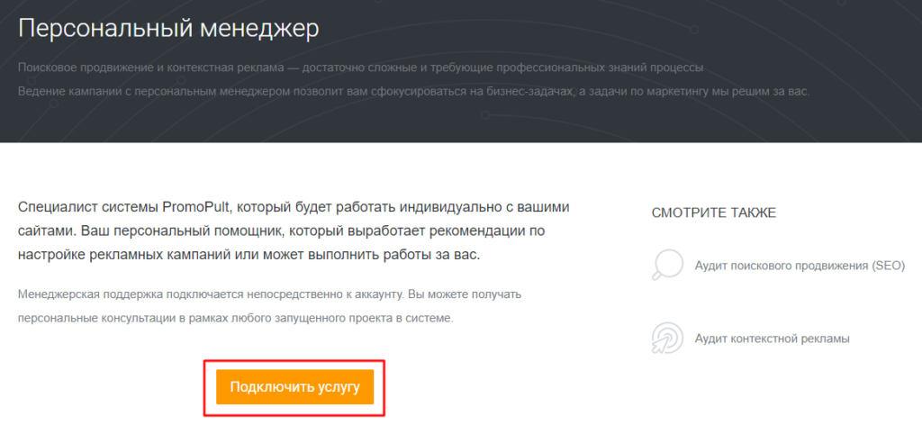 Чтобы подключить персонального менеджера, перейдите на страницу услуги и нажмите на кнопку: