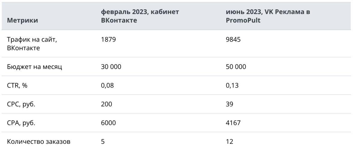 В таблице — результаты кампании в VK Рекламе, запущенной в PromoPult в июне, по сравнению с результатами кампании в старом кабинете ВКонтакте, которую владельцы бизнеса самостоятельно настраивали в феврале.