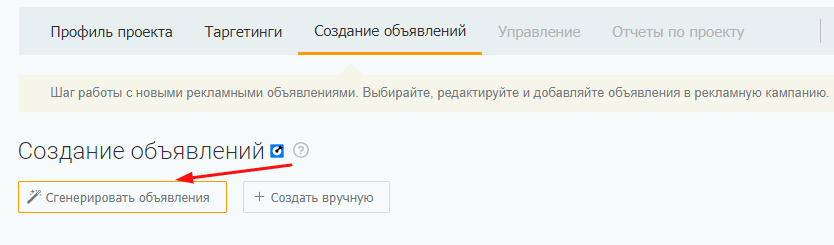 По клику на кнопку «Далее» переходим на шаг создания объявлений. Чтобы сэкономить время, доверим это системе — она создаст заголовки, тексты объявлений, подберет изображения. Останется только отредактировать креативы и запустить рекламу.