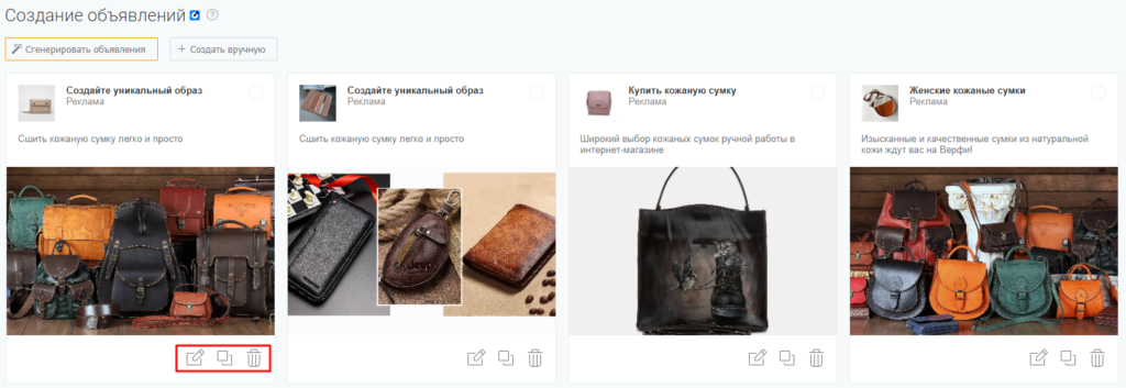 После корректировки ключевых слов нажимаем на кнопку «Создать» и через несколько секунд получаем готовые объявления с изображениями.