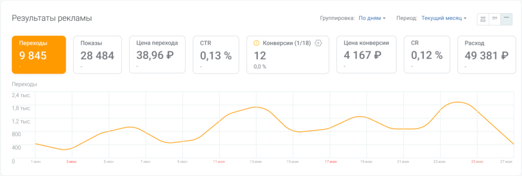 А вот данные на интерактивном дашборде PromoPult, здесь видна динамика показателей за июнь 2023 года: