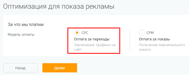 Последний этап на шаге «Таргетинги» — выбор модели оплаты. Для интернет-магазина подходит оплата за переходы: