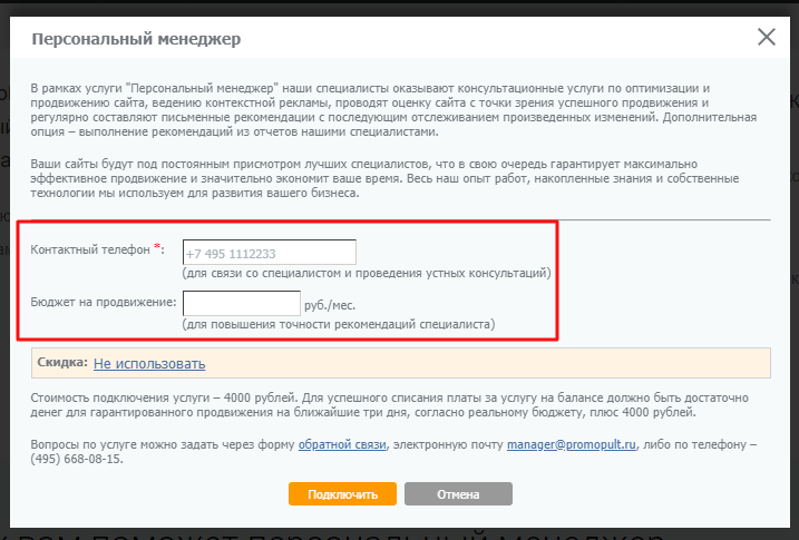 В обоих случаях дальше вы заполняете данные во всплывающем окне — телефон и предполагаемый бюджет на продвижение в месяц. Последнее не обязательно, но повысит точность рекомендаций специалиста PromoPult.