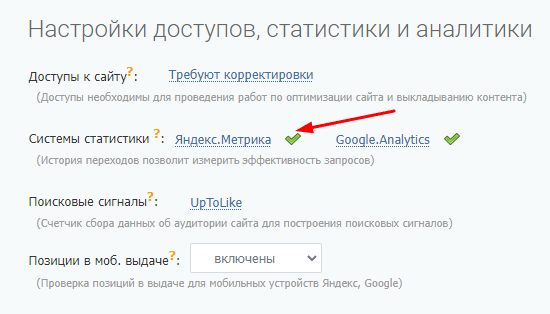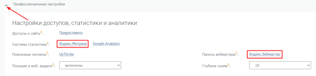 Далее в профессиональных настройках предоставьте доступы к Яндекс Метрике и Вебмастеру: