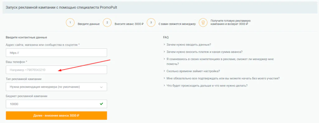 Оставьте контактный телефон. С вами свяжется специалист PromoPult для обсуждения целей и специфики проекта, уточнения бюджета. После беседы специалист бесплатно настроит проект и подключит технологию PromoPult Max.