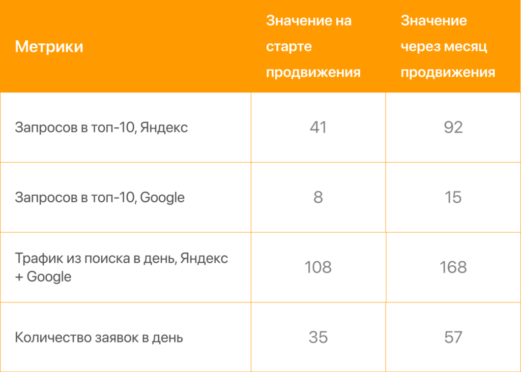 Результат: увеличили количество заявок в 1,5 раза и запросов в топе в 2 раза за месяц
