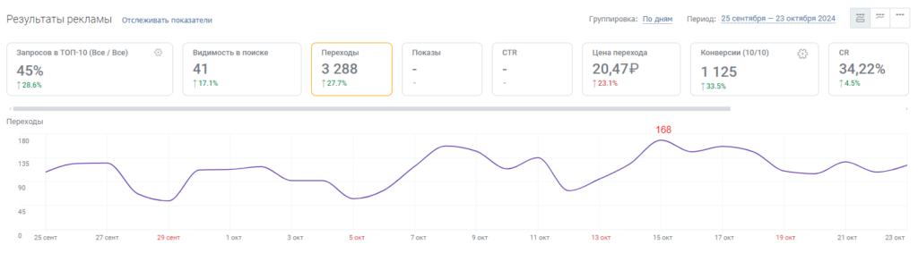 Динамика трафика на дашборде PromoPult — на пике 15 октября 168 переходов
