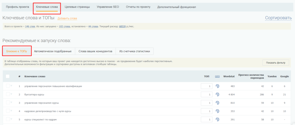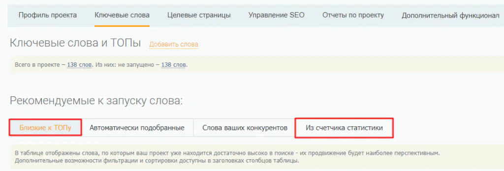 Кликните «Создать проект» и переходите на шаг подбора ключевых слов. Здесь добавьте слова из вкладки «Близкие к ТОПу» и/или из счетчика статистики: