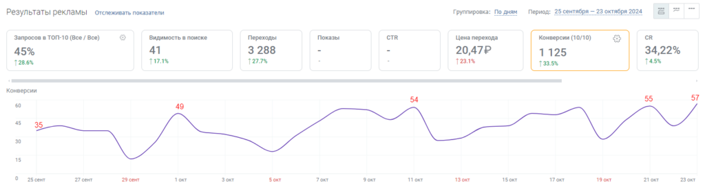 Динамика конверсий на дашборде PromoPult — пиковые значения в 49, 54, 55 и 57 заявок