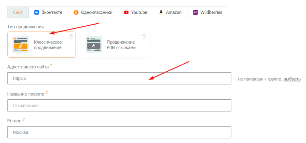 Если уверены, что сможете настроить проект самостоятельно, при заведении SEO-проекта выберите «Классическое продвижение», введите ссылку на сайт и назовите проект: