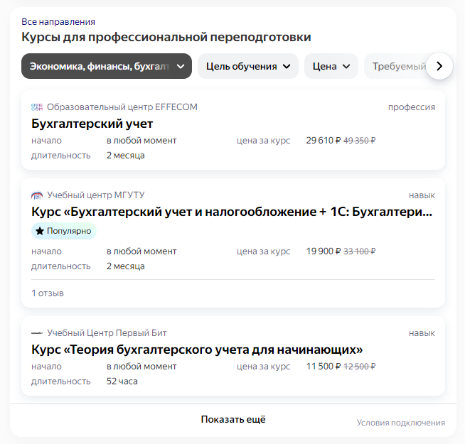 В поиске Яндекса заметное место занимает колдунщик образовательных онлайн-курсов: