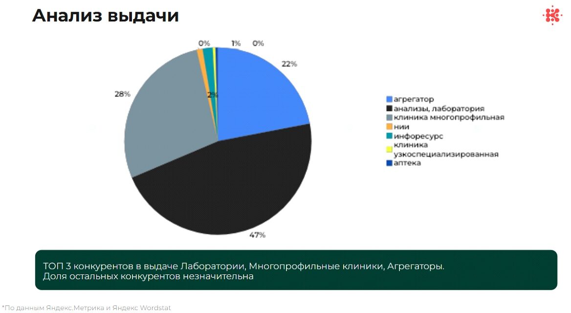 Анализ поисковой выдачи показал: основные конкуренты клиники — это лаборатории по сдаче анализов, многопрофильные клиники с услугой лечения гемостаза и агрегаторы.