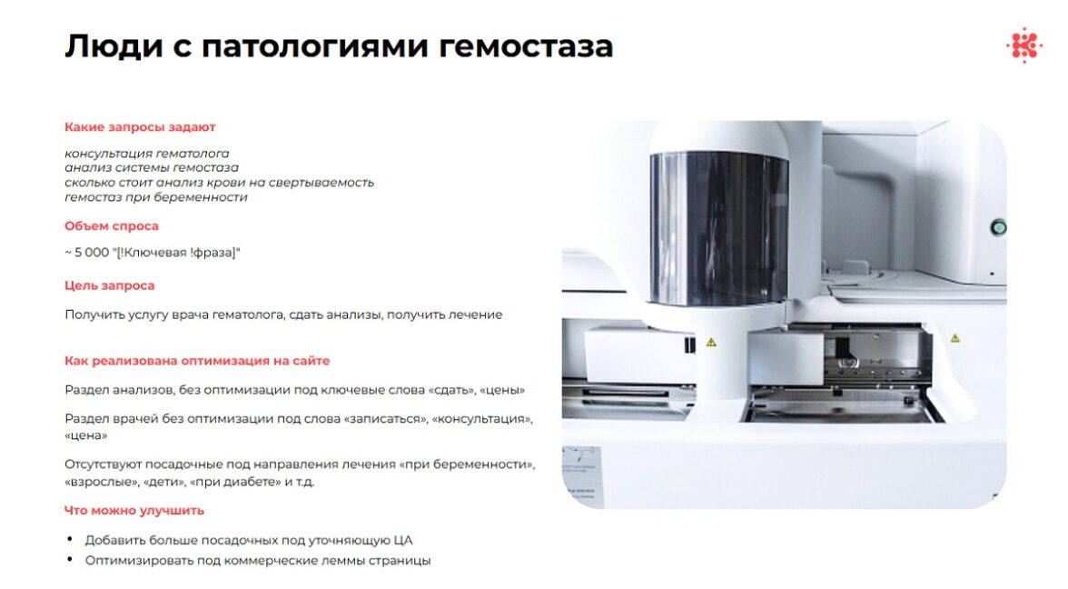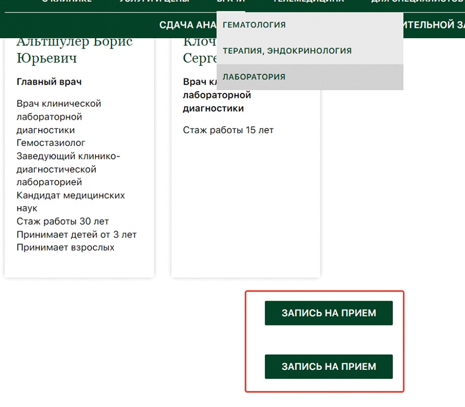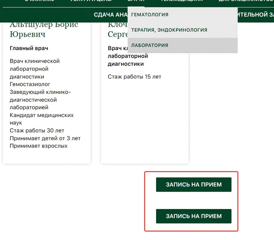 Но коммерческая видимость сайта оказалась критично низкой. Страницы анализов не содержали ключей «сдать» или «цены», в разделе врачей не было слов «записаться», «цена» или «стоимость», а для важных групп пациентов — беременные, взрослые, дети, диабетики — просто не существовало посадочных страниц. Трафик шел в научные разделы, минуя каналы записи.