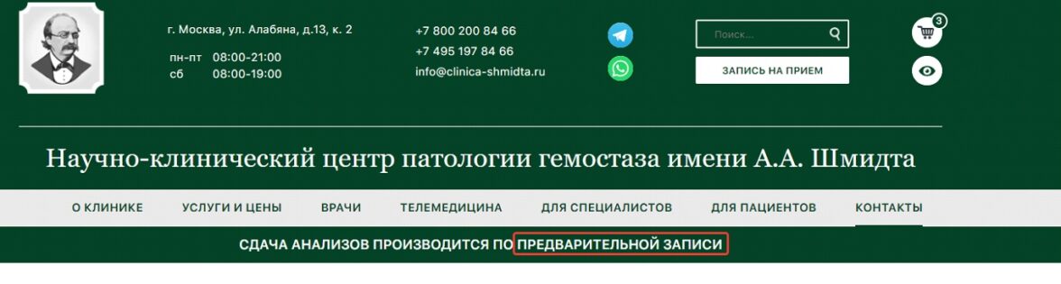 Сегодня рассмотрим проект B2C — сайт научно-клинического центра патологии гемостаза им. А.А. Шмидта — www.clinica-shmidta.ru. Это единственный профильный центр федерального уровня в своей нише. У него нет прямых конкурентов, хорошие позиции в поиске, Центр доминирует в экспертизе… казалось бы, чего еще желать? Тем не менее, клиент задался вопросом: куда двигаться дальше стратегически? Где неочевидные точки роста?