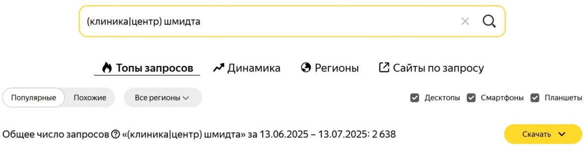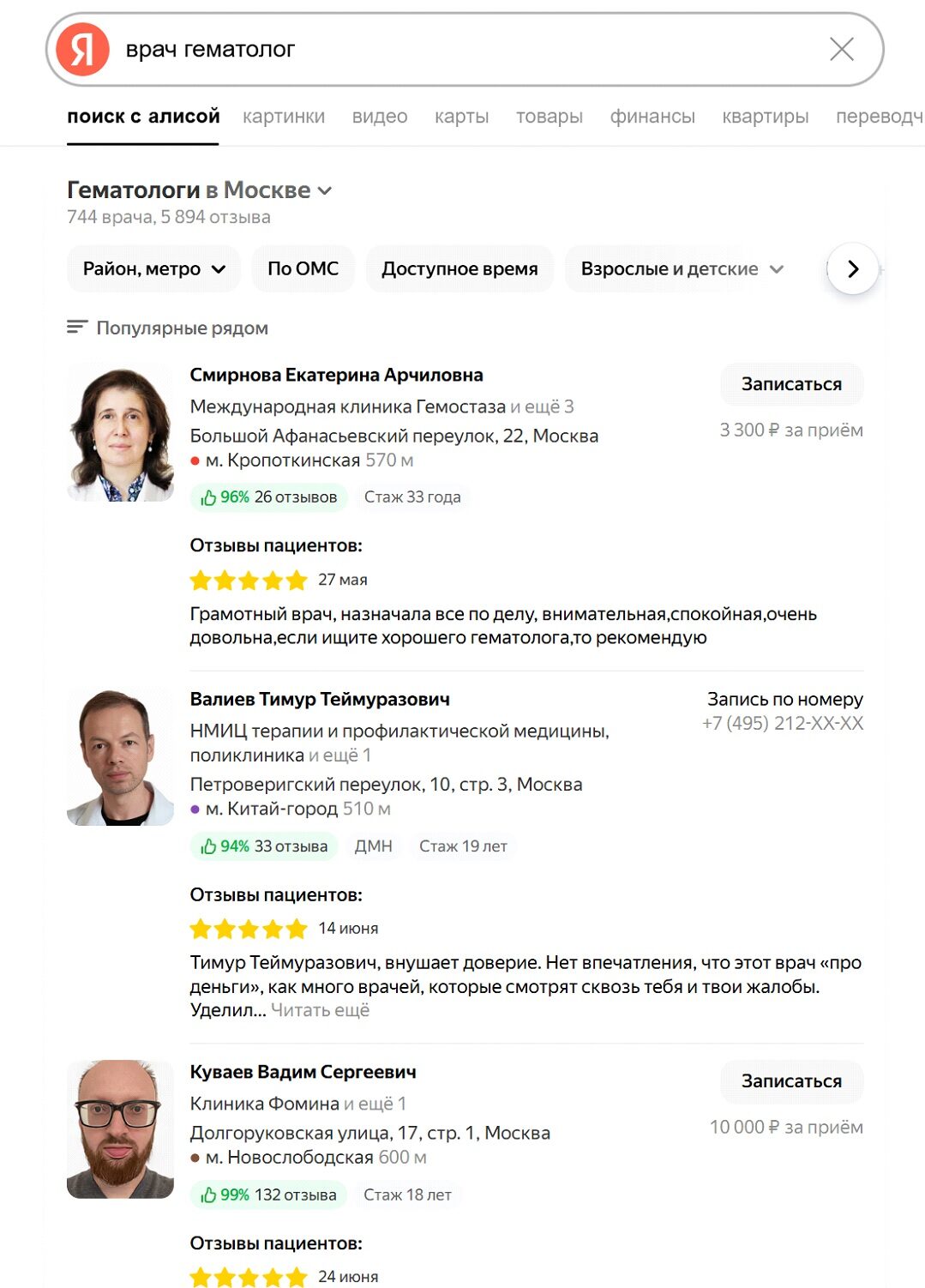 Казалось бы, все отлично! Но официальное название «Научно-клинический центр патологии гемостаза имени А.А. Шмидта» не отвечает поисковым запросам пациентов «клиника гемостаза», «клиника гемостаза в москве», «центр гемостаза». Пациенты ищут решение проблемы, а не официальные регалии и точное название. При поиске по конструкции типа «(клиника|центр) (гемостаз)» в агрегаторах мы видим клинику конкурента: