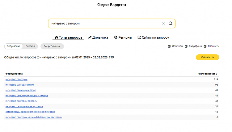 Но если бы мы поменяли название на «Интервью с авторами», суть бы не изменилась, а запросов стало бы намного больше. Запрос «интервью с автором» набирали в поиске за месяц 719 раз.