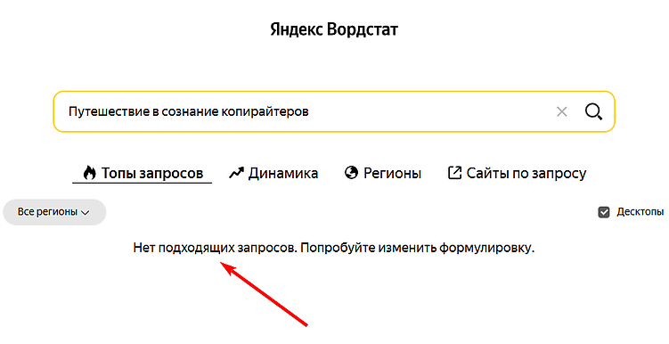 К примеру, в блоге есть старая статья под названием «Путешествие в сознание копирайтеров». Это на самом деле интервью с авторами, но из названия это непонятно. Как говорит «Яндекс Вордстат», таких запросов вообще нет: