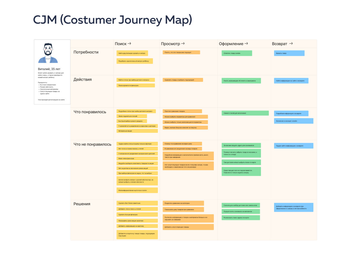 Инструмент визуализации, который лучше помогает представить путь пользователя — от возникшей потребности и поиска информации о продукте до покупки и применения.Ключевая задача CJM — определить различные потребности и барьеры, возникающие у пользователя при взаимодействии с сайтом/сервисом на разных стадиях. Если начать собирать примеры CJM в сети, то вариаций будет много. Тут нет жестких правил, но есть общепринятый фреймворк: