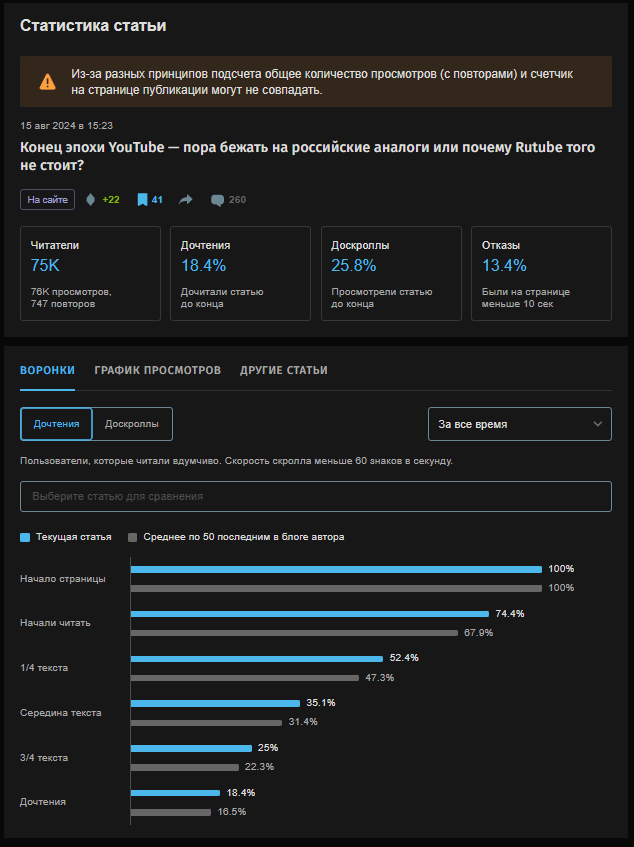 Здесь и лайки с комментариями, и уникальные читатели, и процент «дочтений», и «доскроллы», и «отказы», и выбор временного промежутка по воронкам, и выбор временных промежутков на графике просмотров, и сравнение результатов с другими статьями.