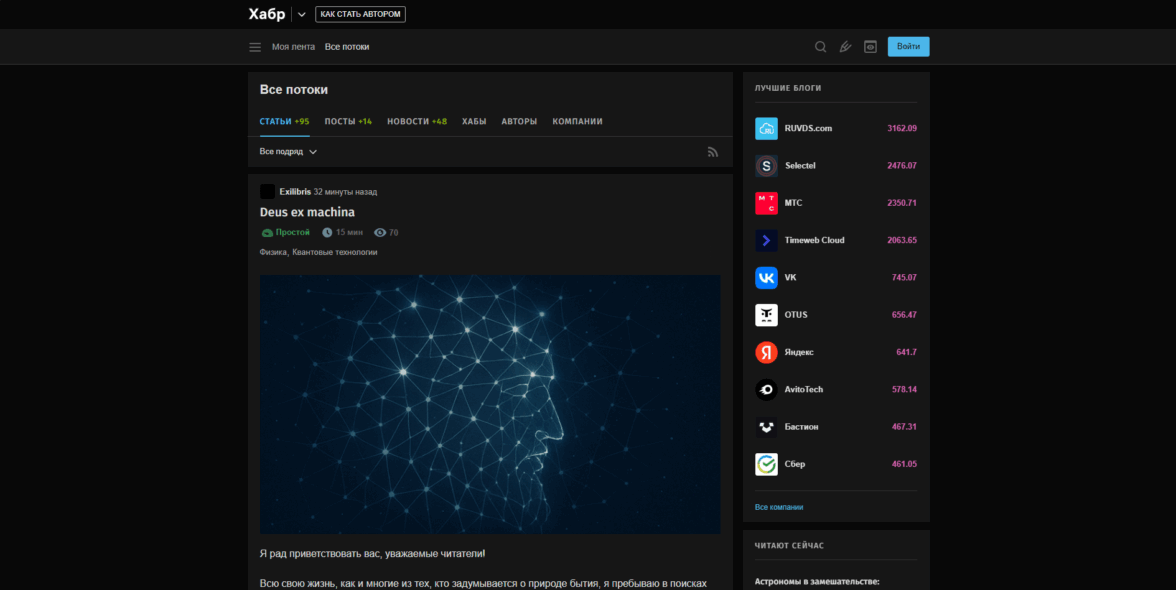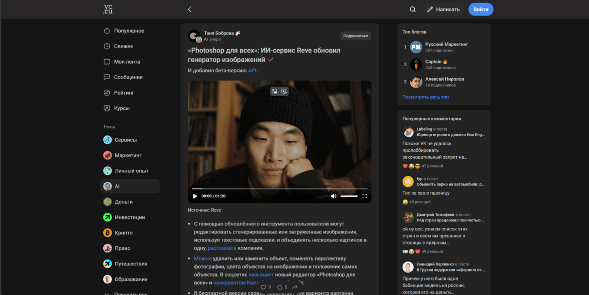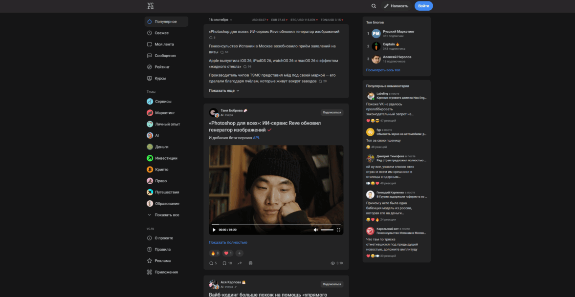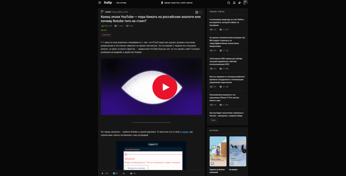 Из плюсов карточки на VC — возможность сразу на главной прочитать саму статью. В таком случае отключится функционал комментариев, но это не помешает вам прочитать материал. Также приятно видеть видео в обложках (это вообще эксклюзив среди трех рассматриваемых сегодня площадок)
