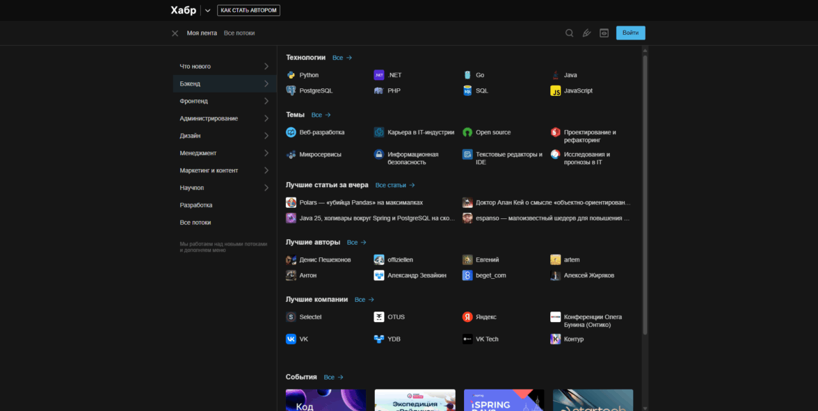 И это просто *****… великолепно! Мне нравится подход, в котором твой экран не занимает миллион бесполезных (для нового пользователя) разделов. Почитал статьи и понял, что хочешь зарегистрироваться и остаться здесь? Вот тебе все, что только может понадобиться по разным темам. И лучшие авторы со статьями, и самые экспертные компании и события, которые могут заинтересовать. Короче, огромный лайк за этот подход.