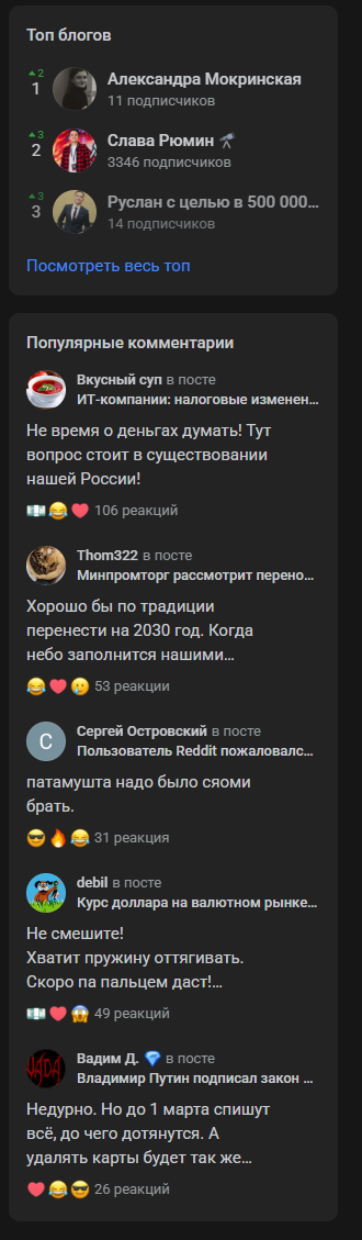 Оооочень странный тейк)Популярные блоги — чтоб ты мог перейти почитать, доп точка входа + получить мотивацию что-то самому написать, как и с комментамиВ комментах — это отличительная особенность VC от других платформ, что тут дофига пишут комментов и часто там рофлы / срач и тд, поэтому имеет смысл это показывать, т.к. многие часто подкупаются на такое.