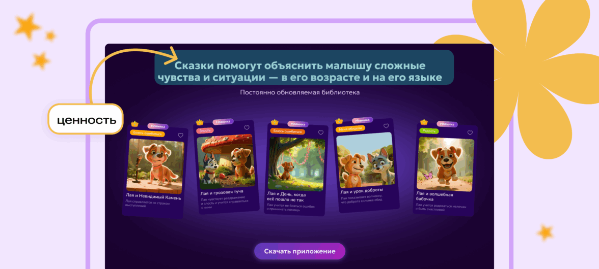 Из интервью мы поняли, что родителям важно занять ребёнка с пользой и найти такой досуг, который бы увлёк его и вызвал интерес к чтению. Всё это мы отразили в текстах и с делали акцент на конкретных вещах — например, многие родители говорили, что им при выборе книг — главного нашего конкурента — важны яркие иллюстрации