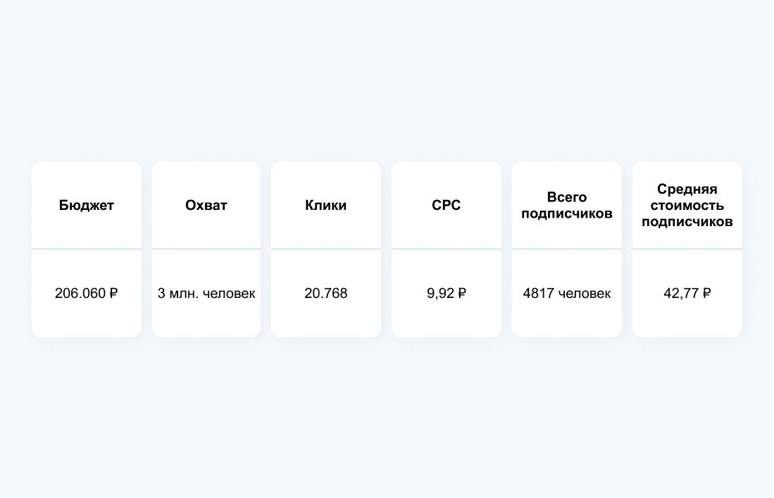 Что касается формата контента, лучше всего сработал пост, сториз собирали в разы меньше подписок, и мы в итоге от них отказались. Кроме РК на трафик мы тестировали также кампании на вовлеченность и на сообщения. Эти стратегии не сработали, поэтому мы сосредоточились на трафике.