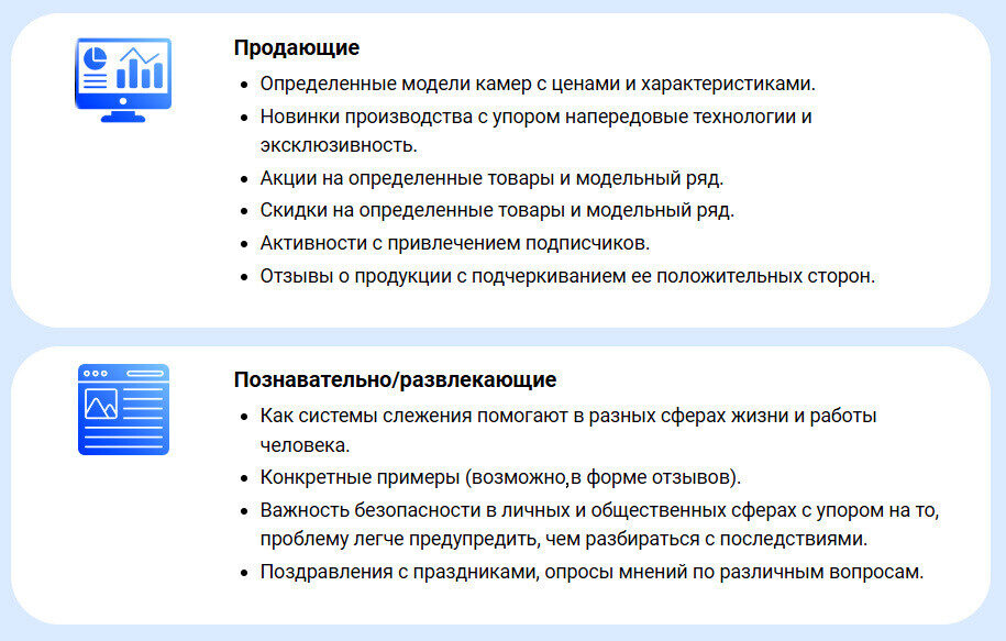 Мы проанализировали целевую аудиторию и выделили широкую (интерес к видеонаблюдению, бизнесу и безопасности) и узкую (инсталляторы систем видеонаблюдения). Анализ конкурентов в нише видеонаблюдения показал, что большинство из них практически не ведут соцсети (исключение — Hikvision и Dahua).