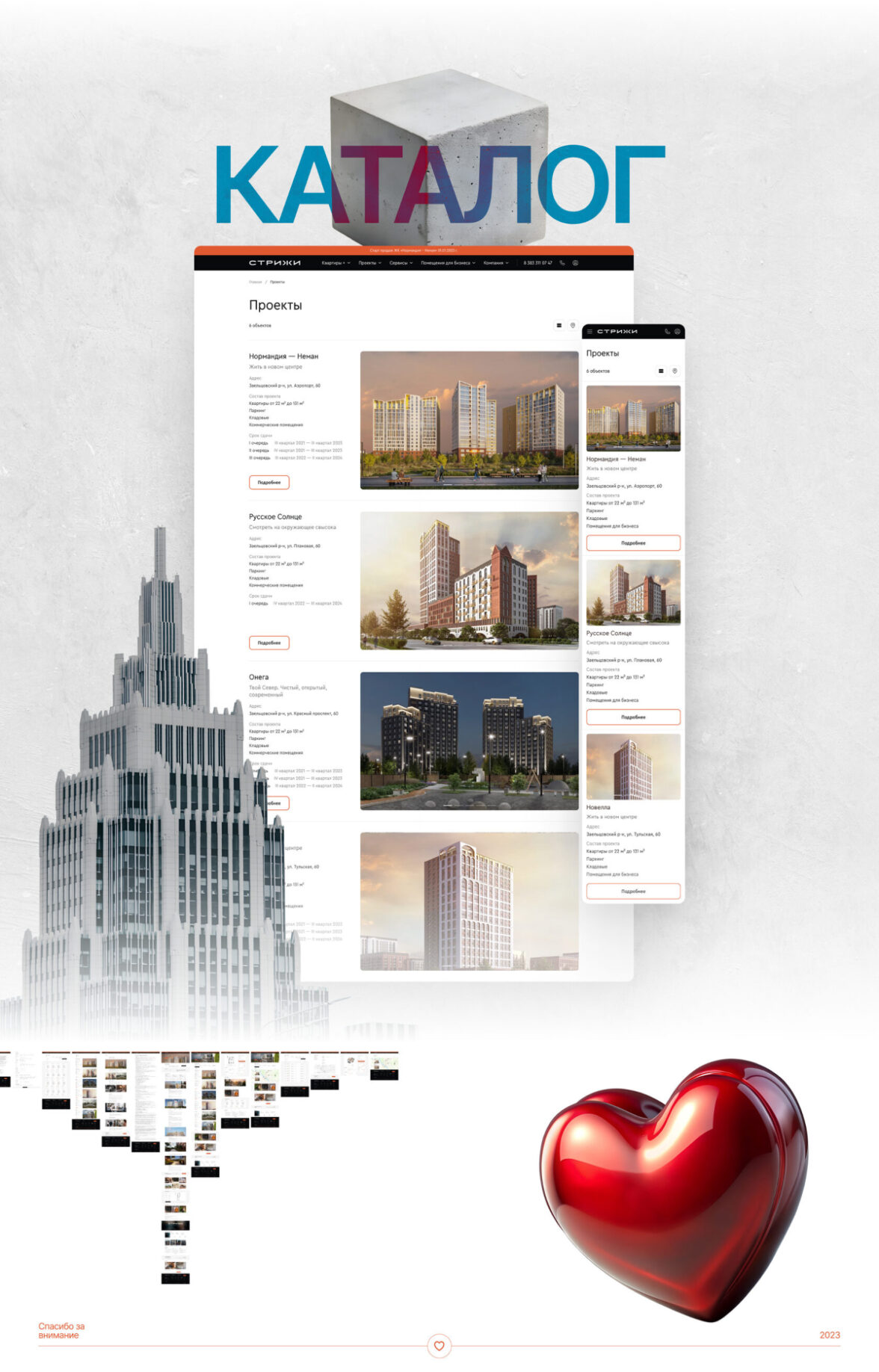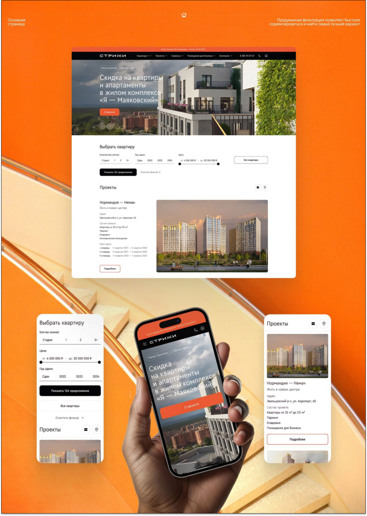 На главной странице реализован привлекательный каталог проектов, где можно легко найти информацию благодаря интерактивному фильтру.