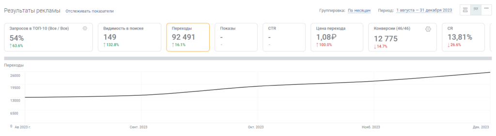 В 2023 году маркетолог клиники решил протестировать PromoPult. При помощи персонального менеджера завели SEO проект и к концу года получили первые результаты — почти двукратный рост переходов из поиска за 5 месяцев продвижения: