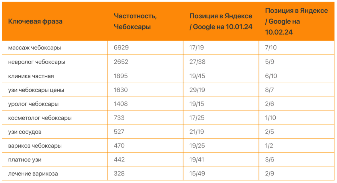 Вот примеры целевых ключевых запросов, по которым выросли позиции сайта с 10 января по 10 февраля 2024 года: