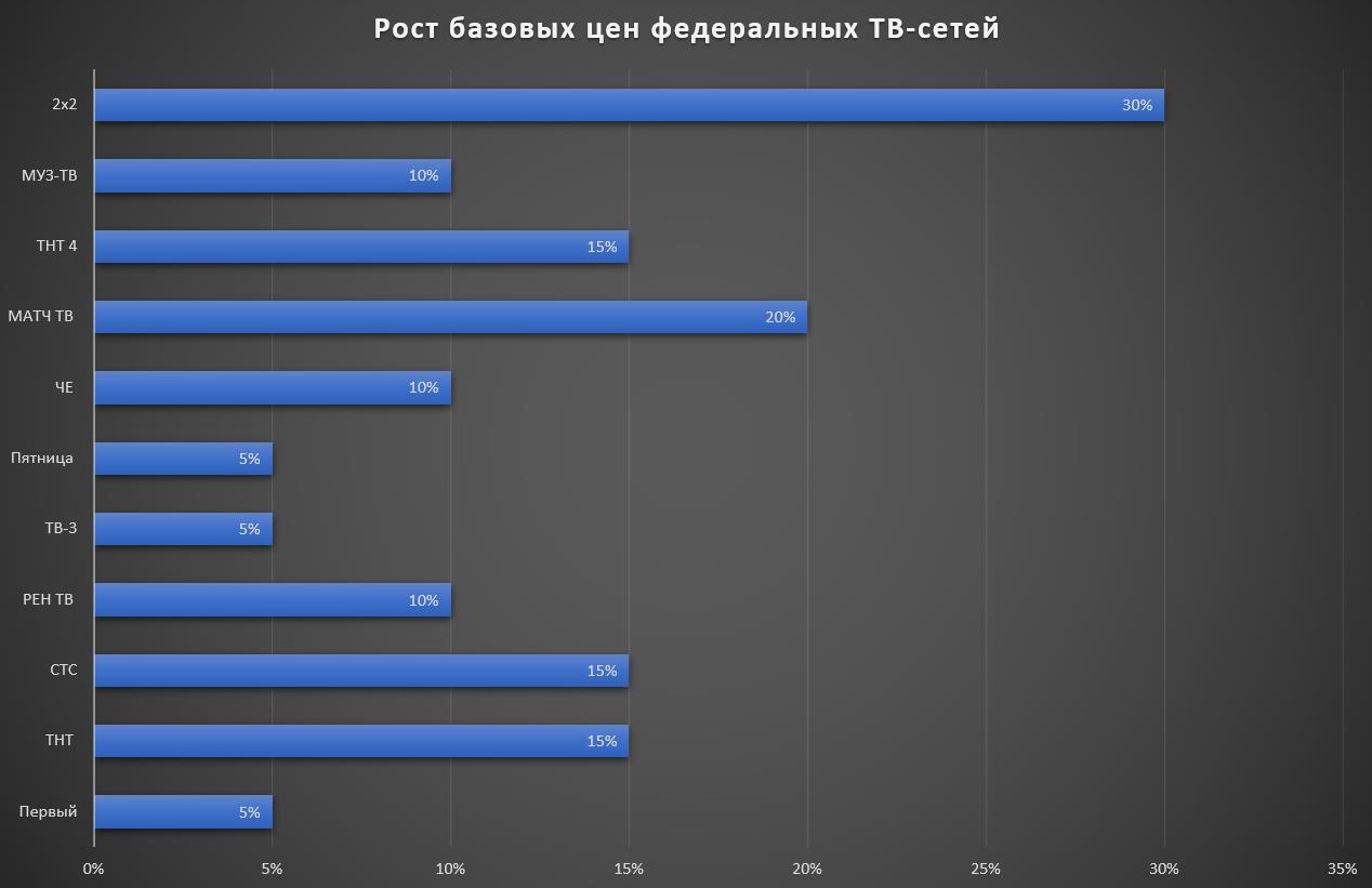 Медиааудитор Tersus подсчитал, что на «Первом», «Пятнице» и ТВ3 базовая стоимость пункта рейтинга (GRP, условная единица при продаже рекламы на ТВ) в августе-декабре увеличится на 5%, на «Рен-ТВ», «Че» и «Муз-ТВ» — на 10%. Цены на каналах СТС, ТНТ и ТНТ4, которые входят в число наиболее популярных у рекламодателей, вырастут на 15%. «Матч ТВ» подорожает на 20%, а 2×2 — на 30% по отношению к расценкам, опубликованным в конце октября 2022 года. Рост цен не затронет «Россию 1», «Россию 24», НТВ, «Домашний», «Пятый канал», ТВЦ, «Звезду».