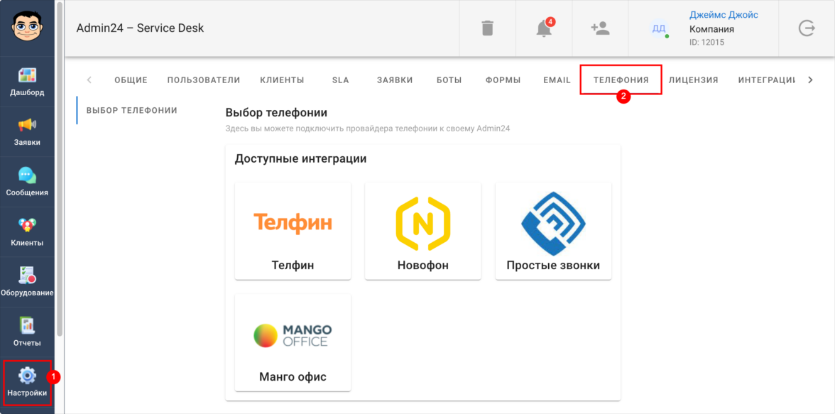 Подключение телефонии в Admin24