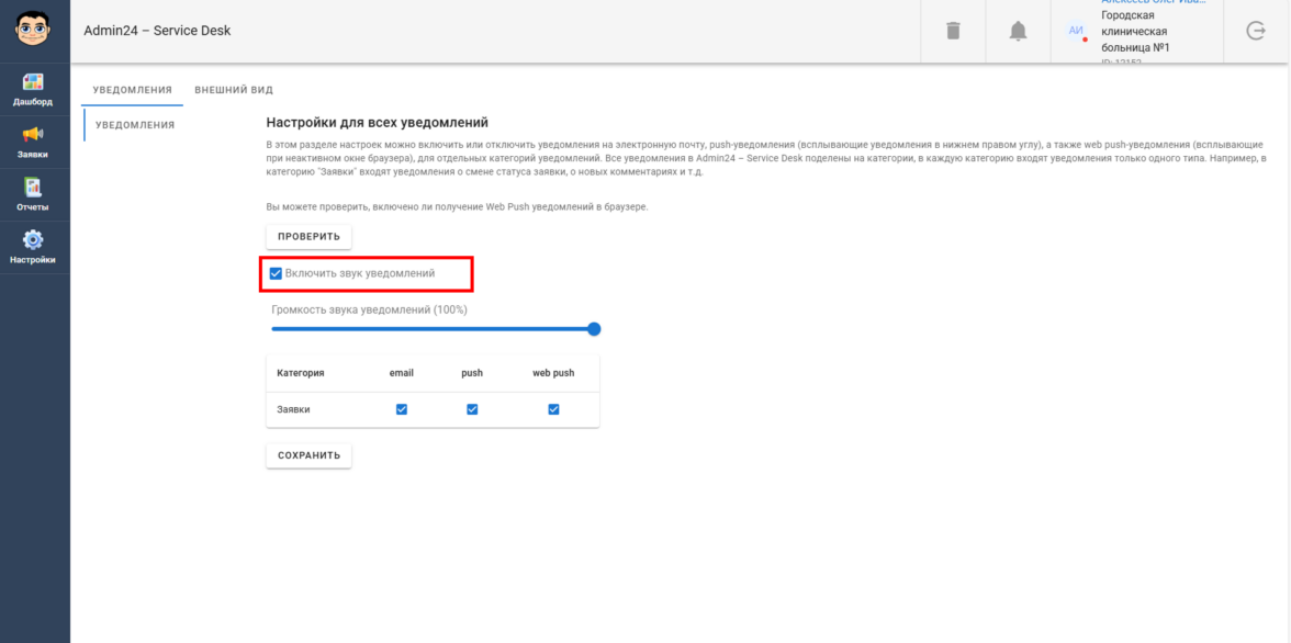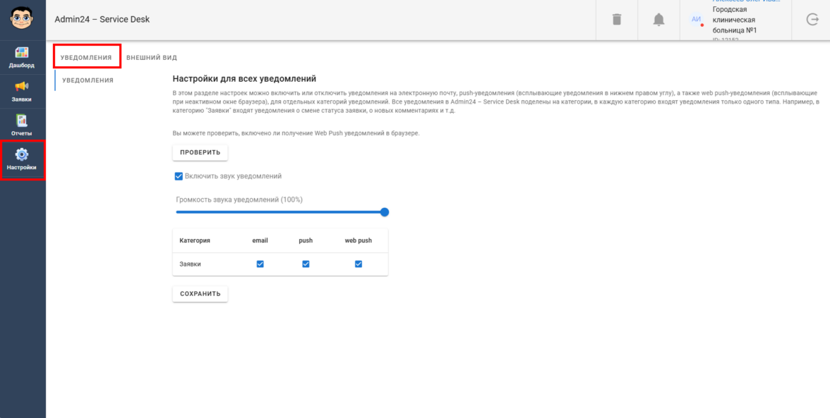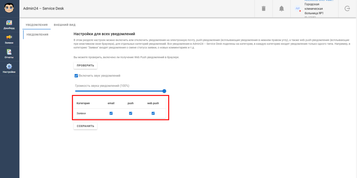 На данный момент в личном кабинете клиента доступна настройка только одной категории уведомлений — по заявкам. В категорию «Заявки» входят уведомления о смене статуса заявки, о новых комментариях и т.д.