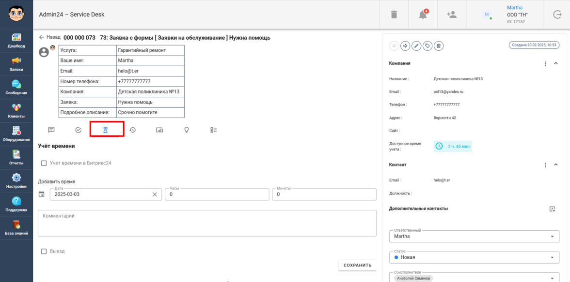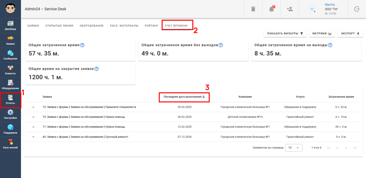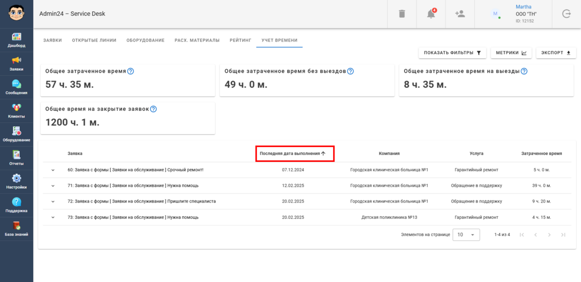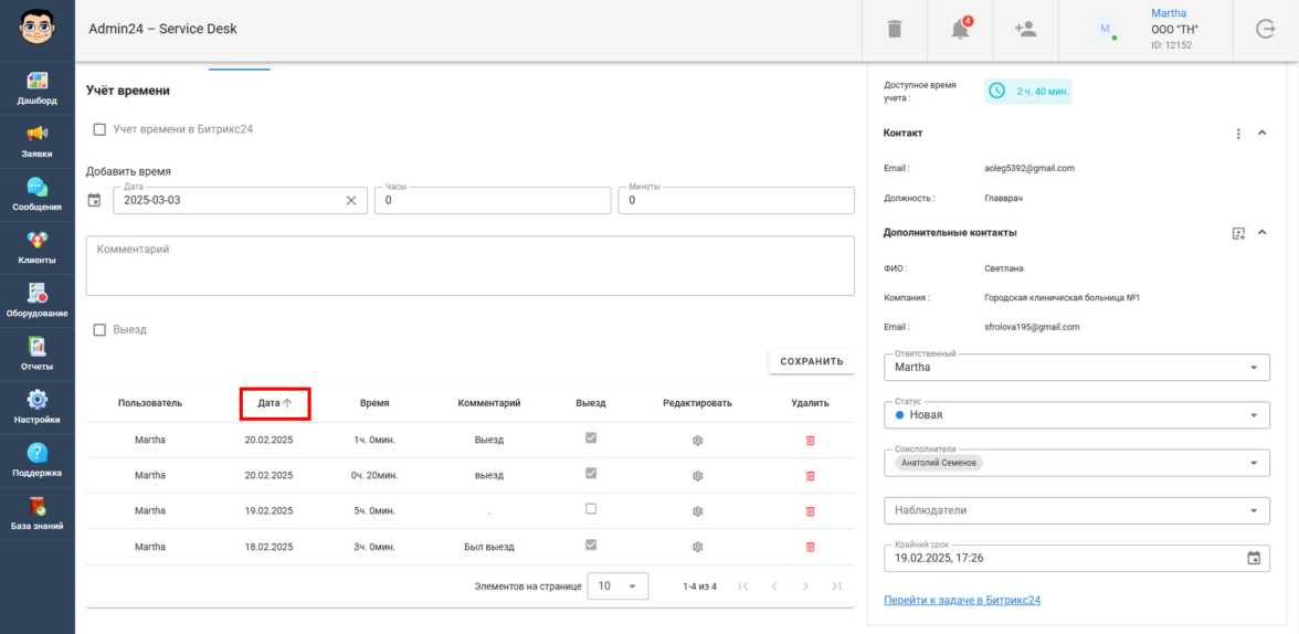 В учете времени на детальной странице заявки появилась возможность сортировки по дате. Для этого перейдите на детальную страницу заявки и откройте вкладку «Учет времени»: