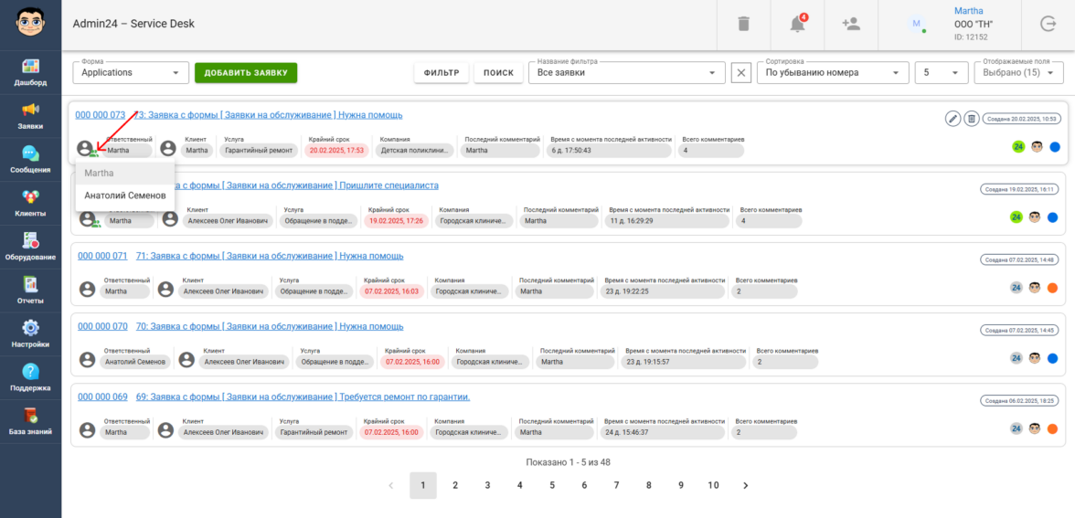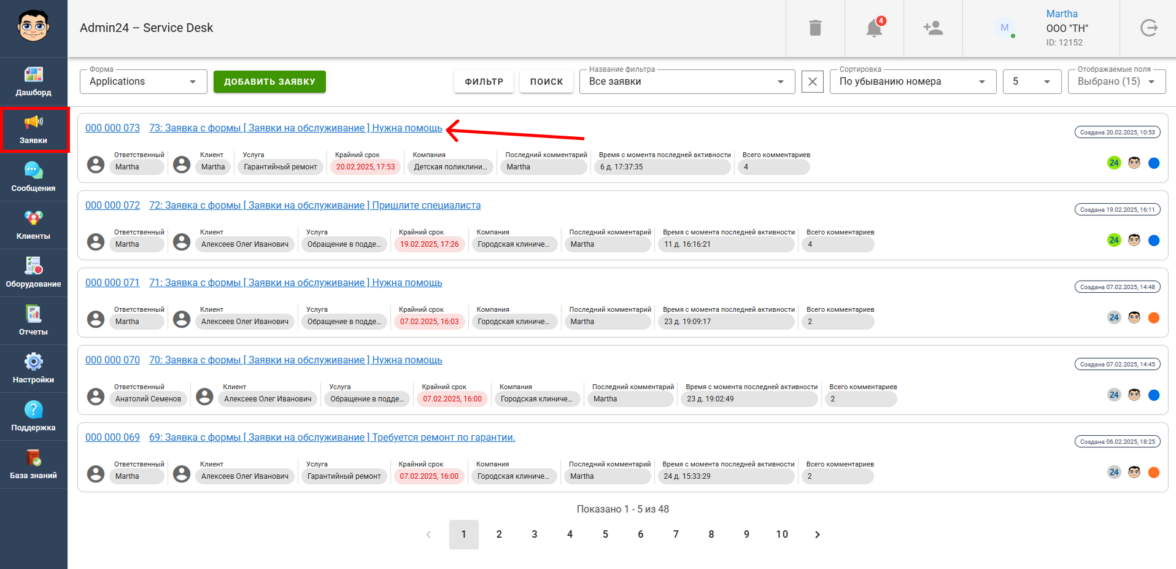 Теперь в Admin24 можно назначать соисполнителей по заявкам. Чтобы это сделать, перейдите в раздел «Заявки», нажмите на нужную заявку и откройте ее карточку: