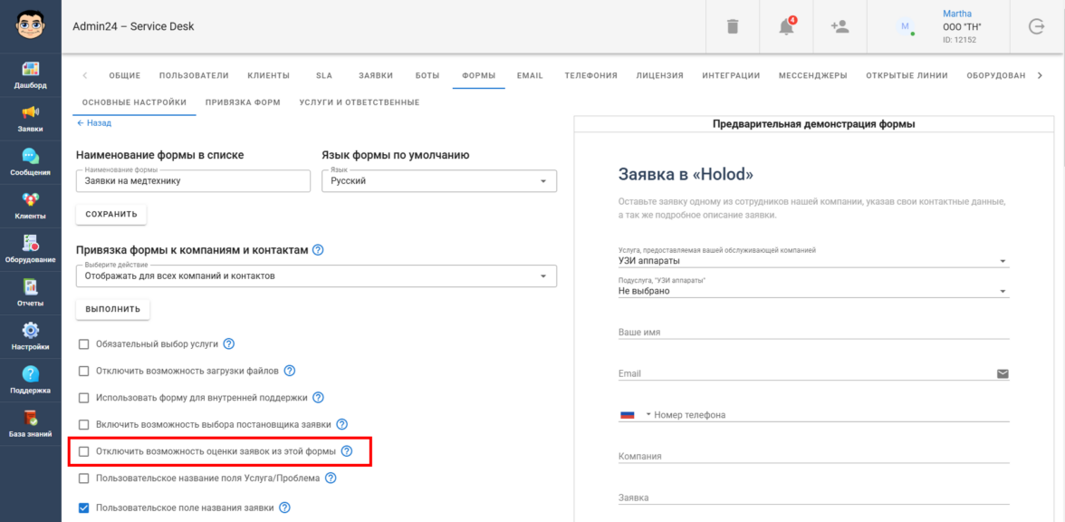 Функция «Отключить возможность оценки заявок из этой формы» не отображается в настройках формы, если в меню «Настройки» → «Заявки» включен чекбокс у настройки «Отключить оценку заявки».