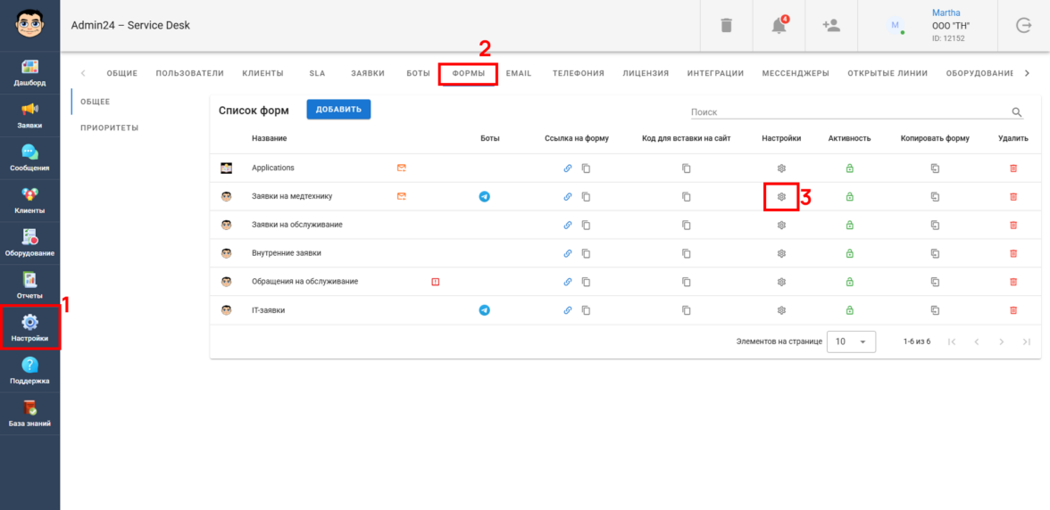 В рамках обновления была добавлена возможность отключать оценку результата выполнения заявки индивидуально для каждой формы. Чтобы это сделать, перейдите в раздел «Настройки» → «Формы» и нажмите на иконку настроек напротив нужной вам формы: