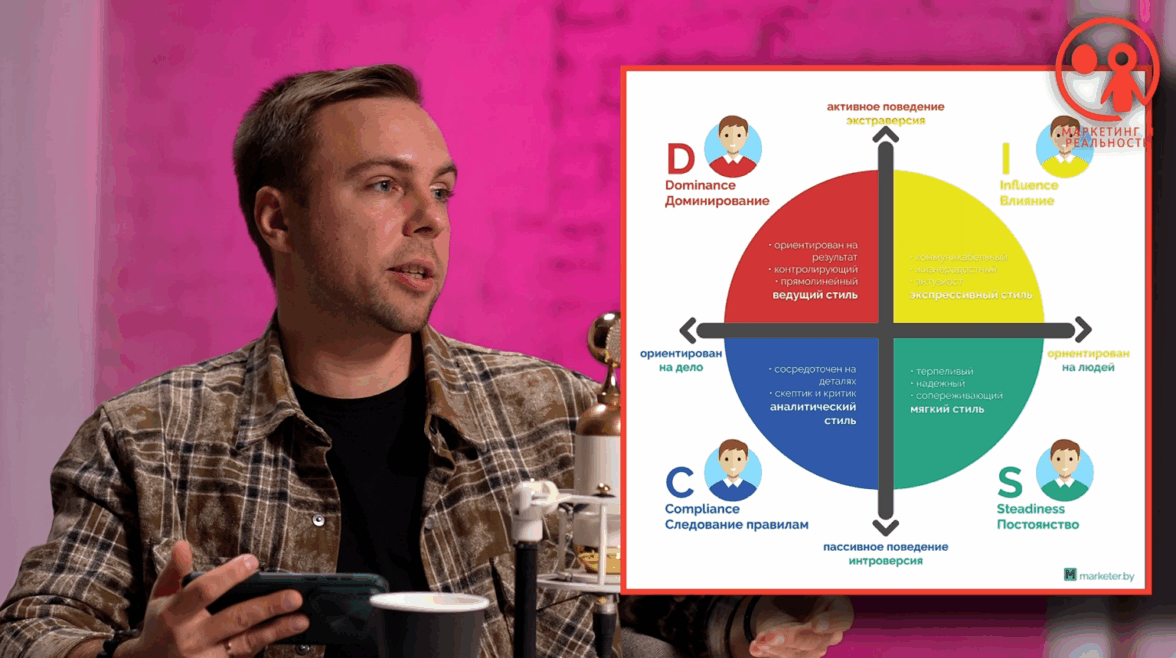 Александр Дяченко: В этой студии мы записывали панельную дискуссию с экспертами Южного форума брендинга, маркетинга и рекламы. Один из наших спикеров (Александр Даценко — основатель агентства Klever Lab) вспомнил модель DISС. Герой с Бунтарем и Магом соотносится с людьми типа D: те, кто предпочитают доминирование. Это экстраверты, направленные на достижение целей.