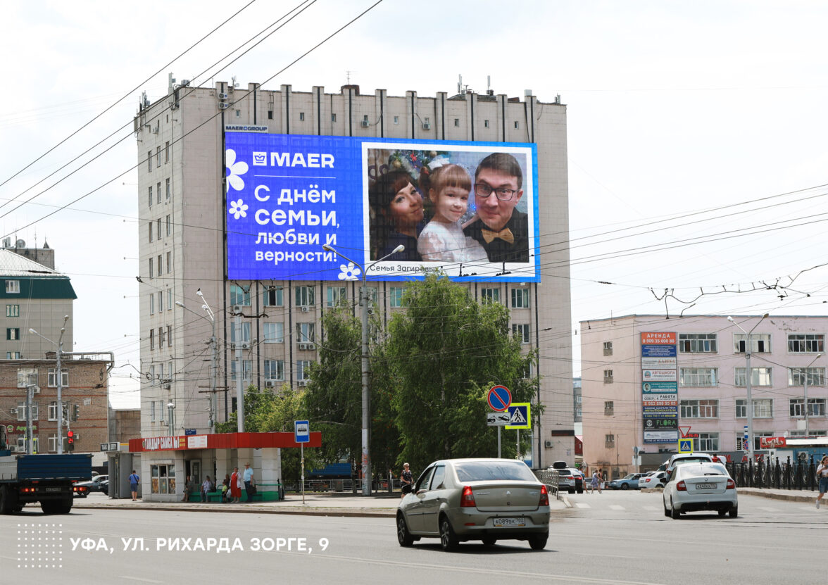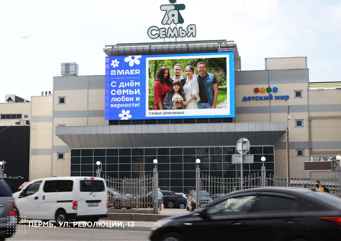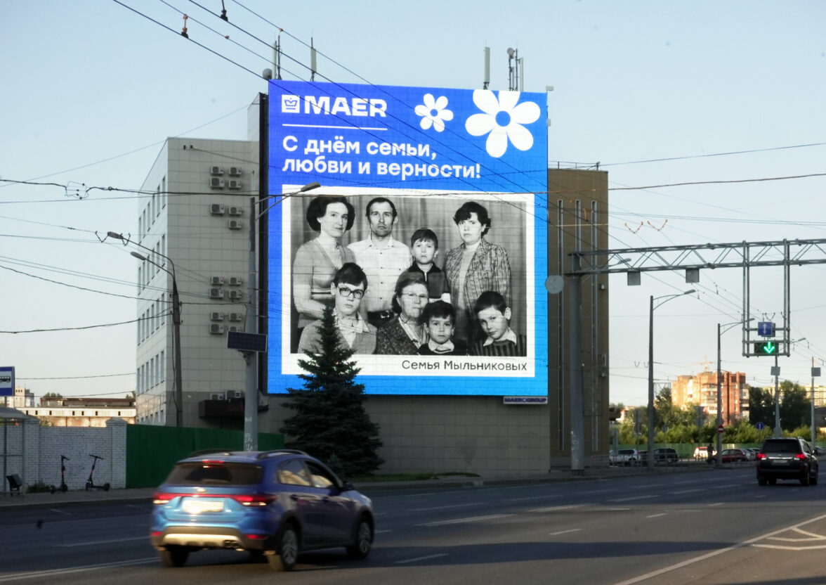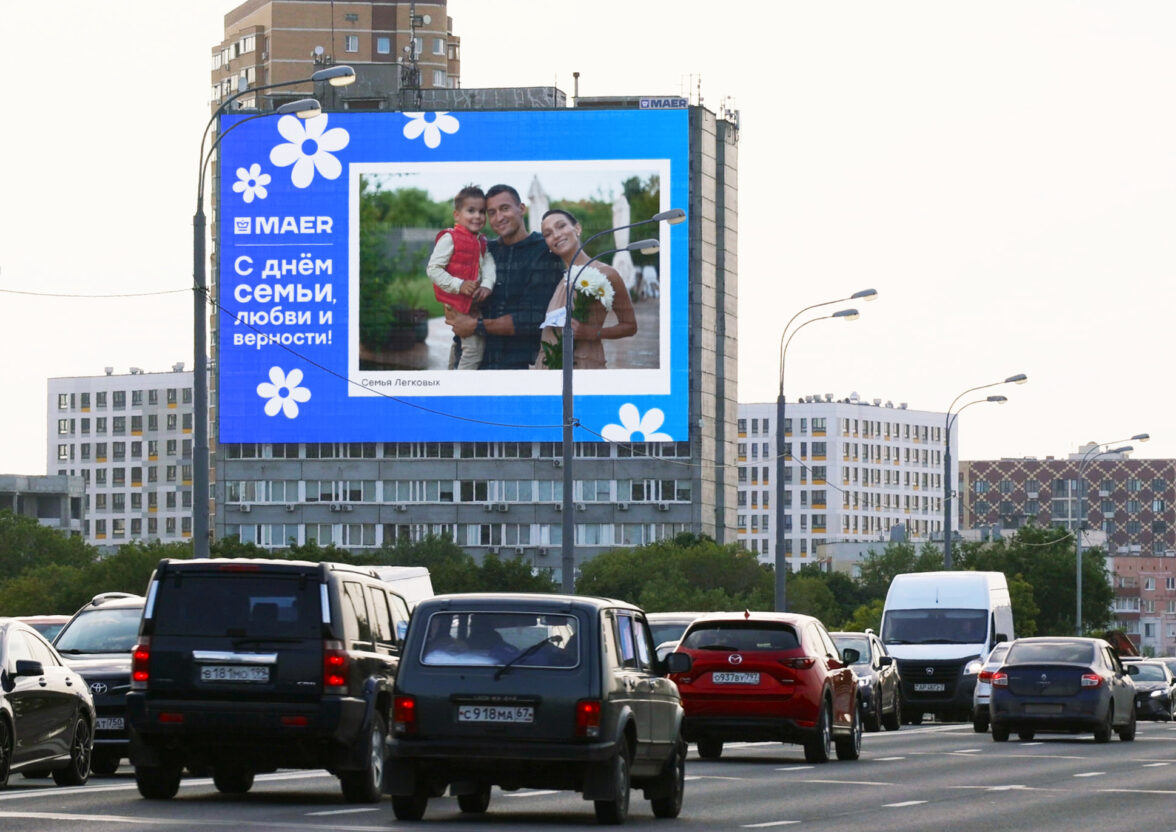 Поздравления с Днём семьи, любви и верности появились на медиафасадах в ключевых регионах страны. Масштабную кампанию запустил медиахолдинг MAER, в ответ на пропаганду гендерной повестки Запада. C 6 по 8 июля крупноформатные цифровые экраны транслировали семейные фотографии друзей холдинга.