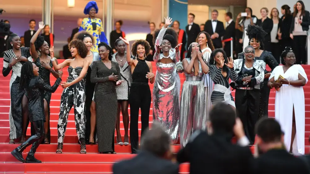 Вслед за ними на лестницу дворца вышли темнокожие актрисы. 16 девушек были одеты в платья от Balmain, которые создал креативный директор — француз африканского происхождения Оливье Рустен. Актрисы несли транспаранты против расистских шуток и нескромных вопросов на кастингах по поводу цвета их кожи.